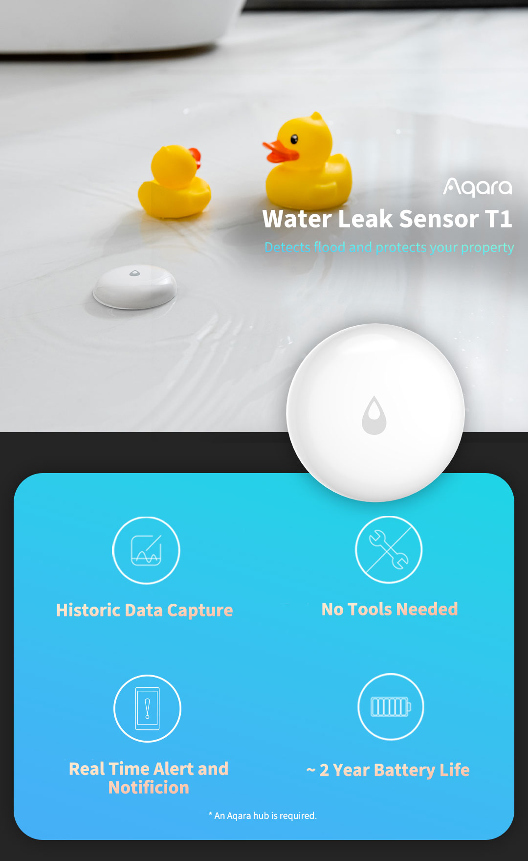 Aqara Water Leak Sensor е сигурен паметен сензор за детекција на вода и протекување, наменет за заштита од поплави во кујни, бањи, подруми или простории со инсталации. При контакт со вода, веднаш испраќа известување и може да активира аларм или автоматизација за спречување на штета. Сензорот е отпорен на влага и наменет за долготрајна употреба.